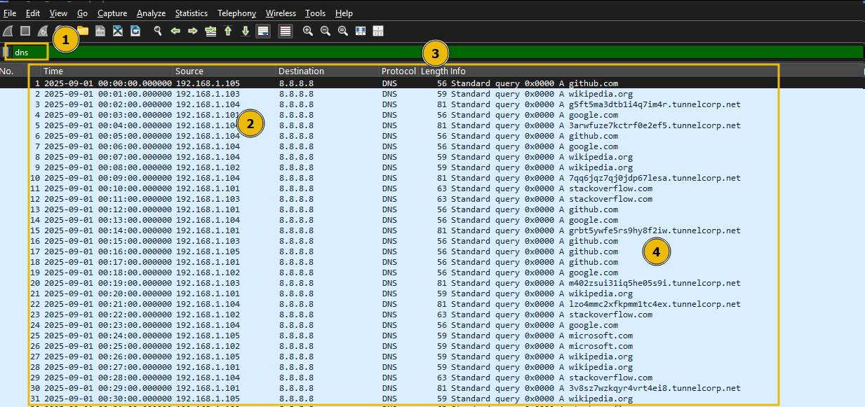 Below are Wireshark display filters, tshark commands, and what to look for when analyzing dns_exfil.pcap.