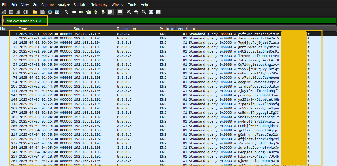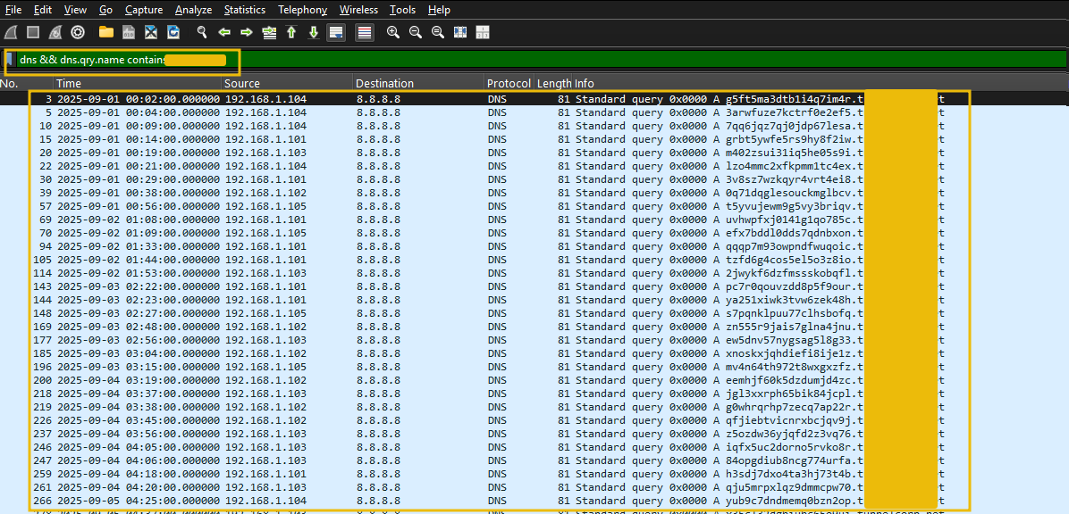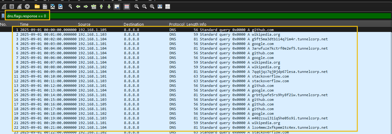 Looks like we have successfully identified the DNS tunneling attempt. From the network traffic, we can observe: