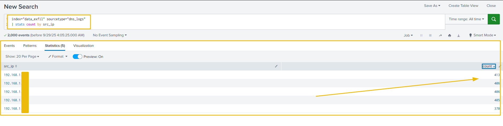 Search Query: index="data_exfil" sourcetype="DNS_logs" | stats count by src_ip