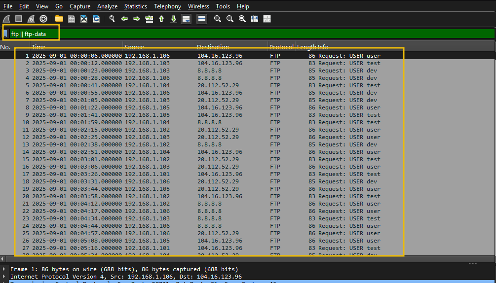 We can look at suspicious files by filtering on the file extensions like PDF, csv, TXT etc. Let's apply a filter on ftp packets containing the term csv in it, as shown below: