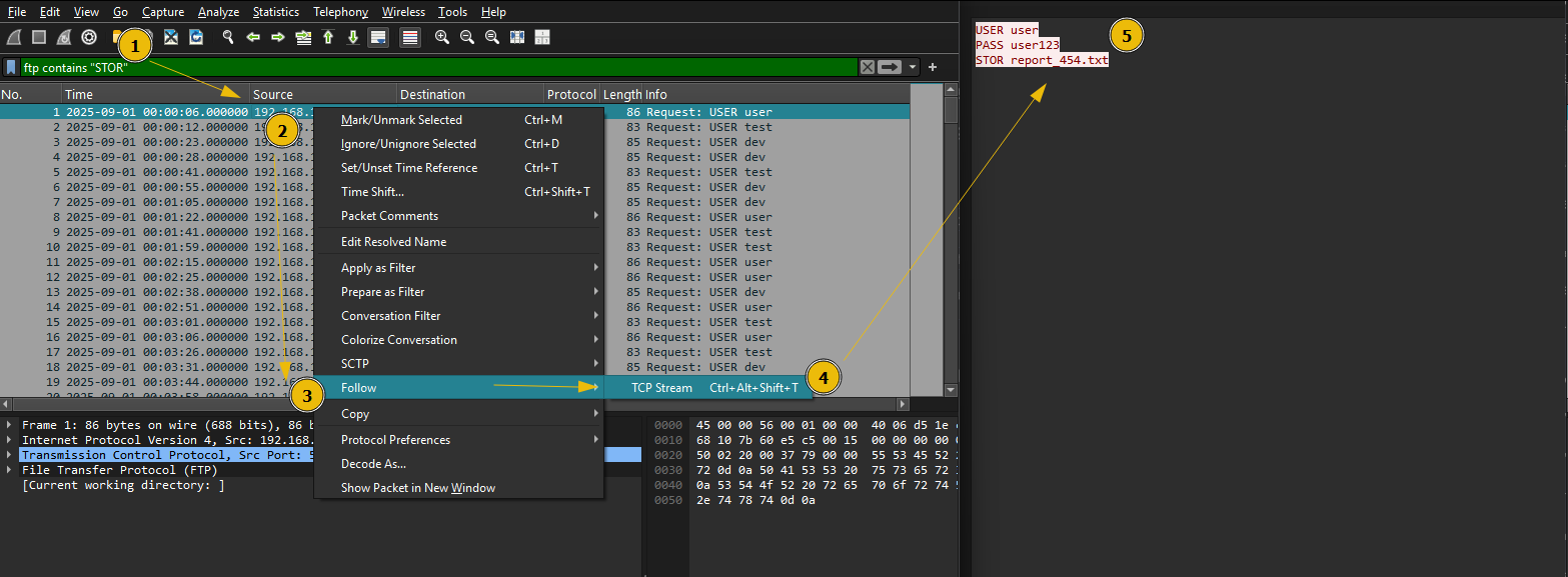 Look at the traffic with a large length, using the filter ftp && frame.len > 90 and check out the content in TCP Stream, as shown below: