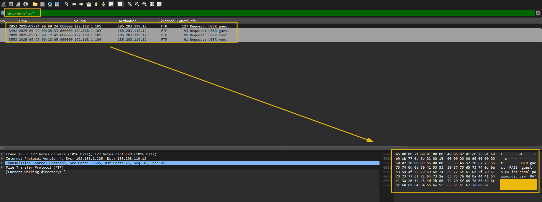 The above results show a suspicious IP connected as Guest account has transferred some sensitive csv files to a supicious external IP.