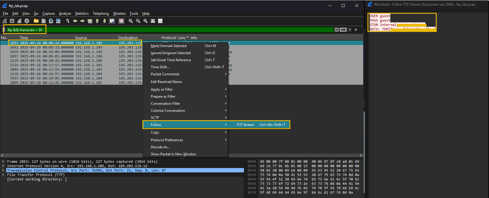 What is the flag hidden inside the ftp stream transferring the CSV file to the suspicious IP? THM{ftp_exfil_hidden_flag}
