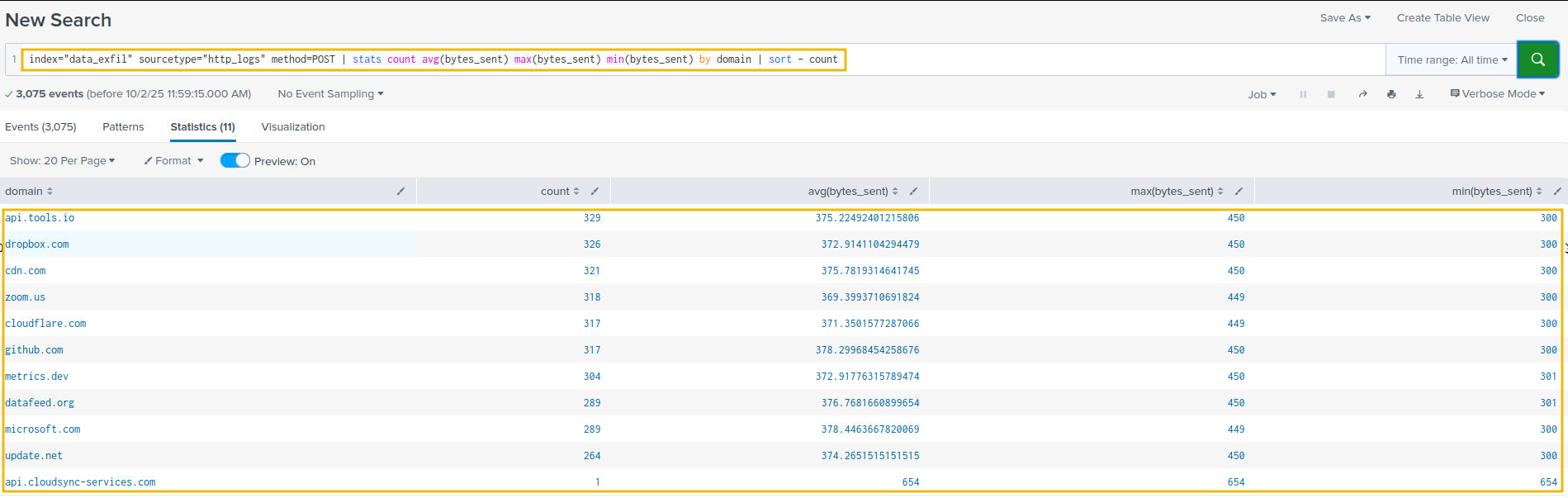 Search Query: index="data_exfil" sourcetype="http_logs" method=POST | stats count avg(bytes_sent) max(bytes_sent) min(bytes_sent) by domain | sort - count
