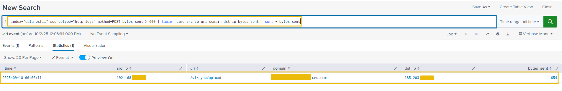 Search Query: index="data_exfil" sourcetype="http_logs" method=POST bytes_sent > 600 | table _time src_ip uri domain dst_ip bytes_sent | sort - bytes_sent